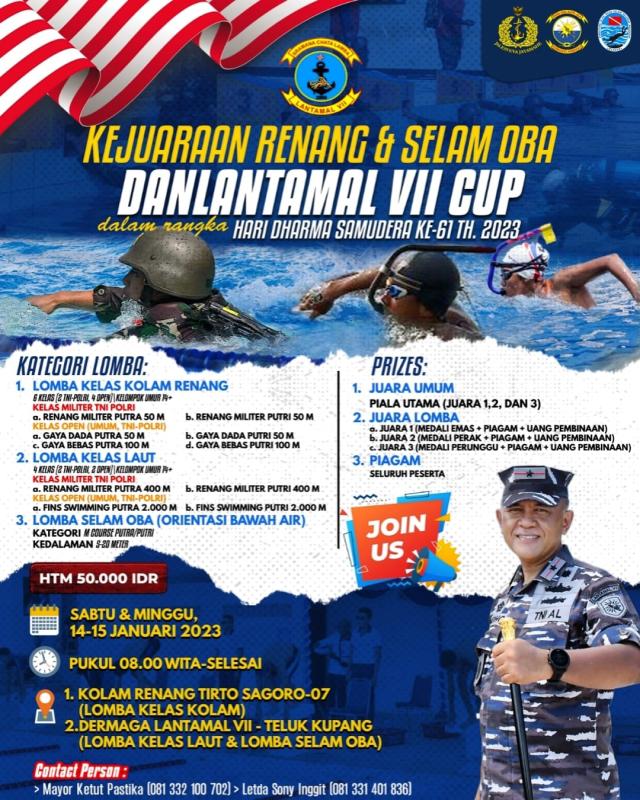 Lomba akan digelar selam dua hari yakni hari Sabtu 14 Januari 2023 dan Minggu tanggal 15 Januari 2023. Lomba renang dilaksanakan di Kolam Renang Tirto Sagoro 07 Lantamal VII Kupang. Sedangkan untuk Lomba Renang Laut dan Selam dipusatkan Dermaga Lantamal VII Kupang. Lomba ini terbuka untuk anggota TNI POLRI dan umum