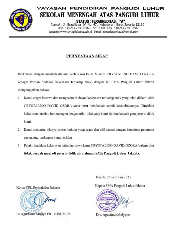 " Kami sangat kecewa dan mengecam tindakan kekerasan terhadap anak yang telah dialami oleh CRYSTALINO DAVID OZORA serta turut mendoakan untuk kesembuhannya," sambung pernyataan sikap SMA Pangudi Luhur.