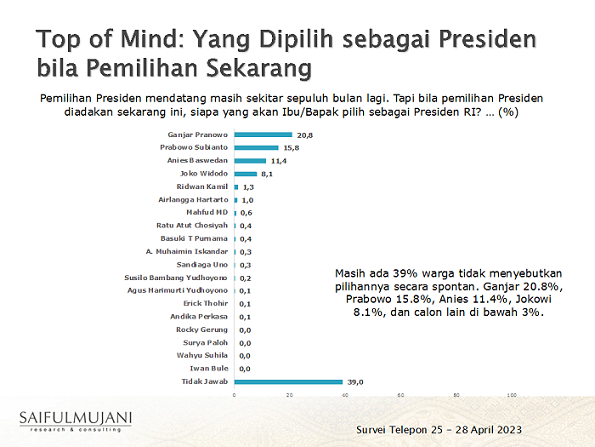 Jakarta, INDONEWS.ID - Dalam survei pada pemilih kritis terakhir, 25-28 April 2023, dalam bentuk pertanyaan terbuka, Ganjar Pranowo dipilih oleh 20,8%, Prabowo 15,8%, Anies Baswedan 11,4%, dan nama-nama lain jauh di bawah mereka. Hal ini mengindikasikan bahwa Ganjar mengalami kenaikan signifikan dari 13% pada 4-7 April 2023, baru setelah keputusan FIFA yang membatalkan Indonesia menjadi tuan rumah Piala Dunia U20, menjadi 20,8% pada 25-28 April 2023 baru setelah keputusan PDI-P mencalonkan Ganjar.