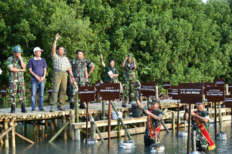 Di lokasi penanaman mangrove, Panglima TNI mengucapkan terima kasih kepada para personel TNI-Polri, perwakilan masyarakat, mahasiswa dan pelajar yang sudah ikut berpartisipasi program penanaman mangrove nasional.