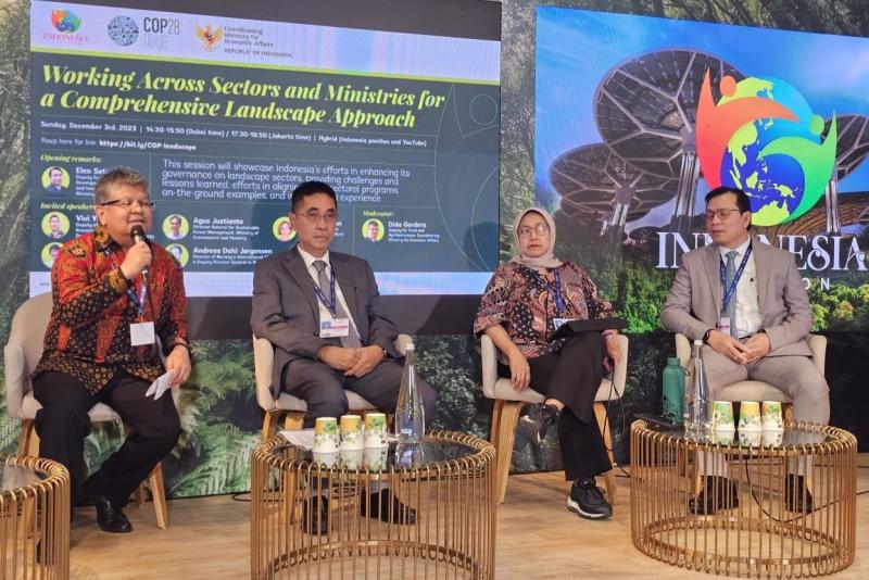 Pada kesempatan ini, Kemenko Perekonomian bekerja sama dengan World Bank menggelar talkshow di Paviliun Indonesia pada 3 Desember 2023, yang mengangkat tema “Working Across Sector and Ministries for a Comprehensive Landscape Approach”. Sesi tersebut dibuka oleh Deputi Bidang Koordinasi Pengembangan Usaha BUMN, Riset dan Inovasi Kemenko Perekonomian Elen Setiadi.