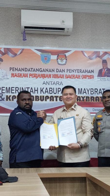 Jakarta, INDONEWS.ID - Pemerintah Kabupaten Maybrat, diwakili oleh Pj. Bupati Dr. Benhard E. Rondonuwu, S. Sos, M.Si, bersama jajaran pejabat seperti Pj. Sekda Kabupaten Maybrat Fernandus Taa dan Kapolres Kabupaten Maybrat Kompol Ruben Obed Kbarek melakukan penandatanganan dan penyerahan Naskah Perjanjian Hibah Daerah (NPHD) kepada Komisi Pemilihan Umum (KPU) Kabupaten Maybrat, Jumat, 15 Desember 2023 di Rylich Panorama Hotel.