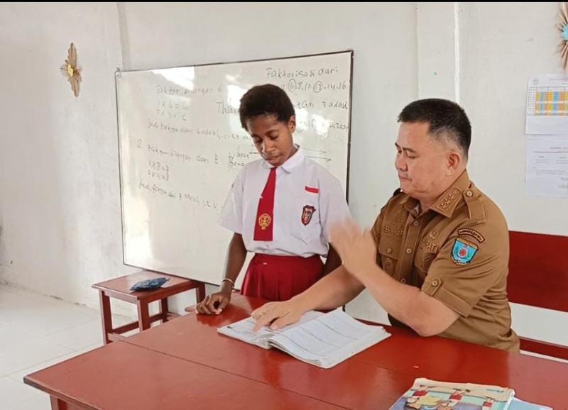 Pj. Bupati Maybrat turut mengunjungi beberapa kelas di SD YPPK Santo Petrus Yarat Konja untuk mengamati proses pembelajaran yang tengah berlangsung. Dalam kunjungannya, beliau tak hanya sebatas menjadi penonton, melainkan juga langsung terlibat dalam uji kemampuan baca siswa.
