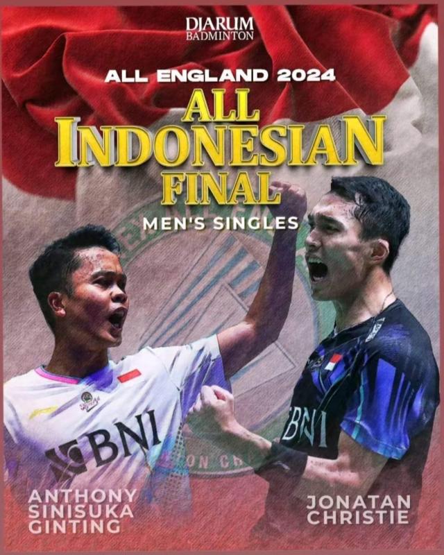 Final tunggal putra All England 2024 akan mempertemukan dua wakil Indonesia yaitu Ginting vs Jonatan alias Jojo.