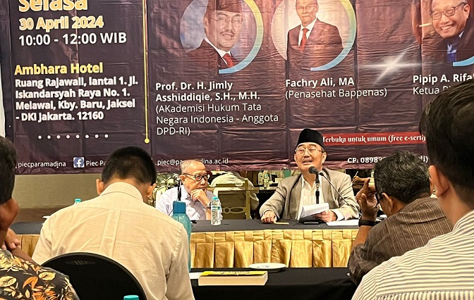 Hal tersebut disampaikan oleh Prof. Dr. H. Jimly Asshidiqie, S.H., M.H. pada diskusi “Etika, Hukum dan Masa Depan Demokrasi Politik: Evaluasi dan Refleksi Keputusan Mahkamah Konstitusi tentang Pilpres 2024” yang diselenggarakan oleh Paramadina Institute of Ethics and Civilization (PIEC) bekerja sama dengan Yayasan Persada Hati dan Maha Indonesia, Selasa (30/4/2024).