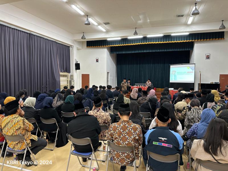 Dr. KH. Muhammad Hasib Wahab kepada peserta diskusi yang dimoderatori Koordinator Fungsi Politik KBRI Tokyo Ali Andika Wardhana menjelaskan seputar Resolusi Jihad yang menjadi titik awal perlawanan semesta melawan tentara sekutu dari kaum santri dan rakyat. “Beberapa tokoh-tokoh nasional, Muhamadiyah, NU dan para ulama sowan ke KH Hasyim Ashari untuk berdiskusi terkait dengan ancaman tentara sekutu dan Belanda yang berniat menjajah kembali Indonesia.