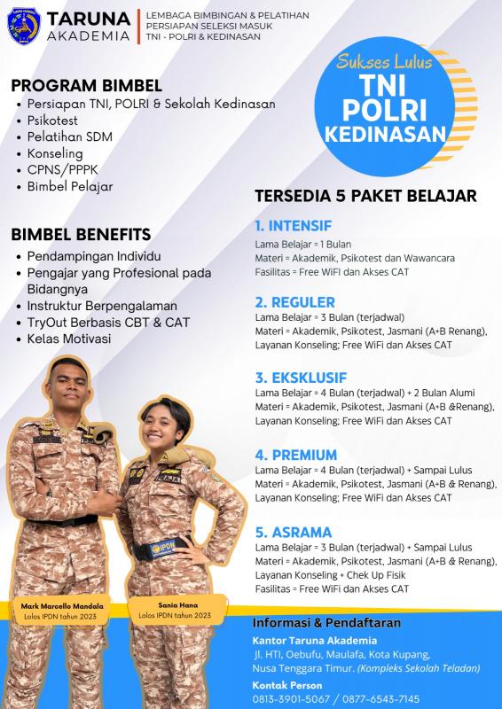 Masyarakat dapat memastikan kebenaran informasi atau layanan dengan langsung menghubungi Taruna Akademia di Jl. Arif Rahman, Oebobo, Kota Kupang (samping Taman Nostalgia Kupang) atau melalui kontak resmi di +6282341487848 dan +6281339015067.