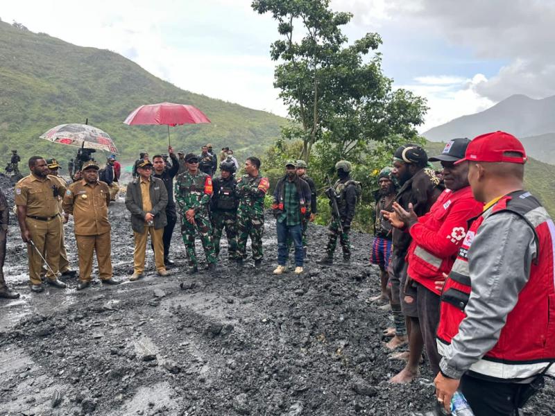 Puncak Jaya, INDONEWS.ID - Dansatgas Pamtas Kewilayahan Yonif 715/Mtl berserta Apkam lainnya mendampingi Penjabat Bupati Puncak Jaya, Yopi Murib, S.E., M.M. mengunjungi lokasi bencana tanah longsor yang menutup akses jalan utama menuju ke Distrik Mulia yang berada di Distrik Kalome, Papua, Selasa (7/01/2025).