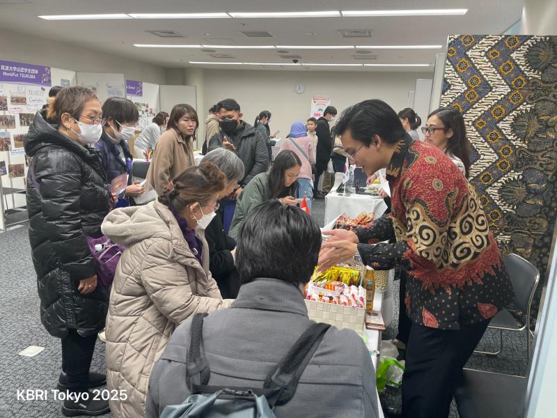 Stan KBRI Tokyo menyajikan tampilan sejumlah produk kuliner khas Indonesia sebagai omiyage (suvenir) bagi para pengunjung serta pengenalan produk batik Indonesia.