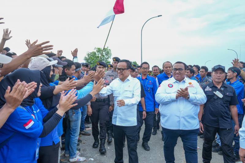 Selain Wamenaker Noel, hadir juga Presiden Konfederasi Serikat Pekerja Seluruh Indonesia (KSPSI), Andi Gani Nena Wea di tengah kerumunan aksi unjuk rasa tersebut.