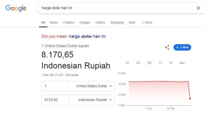 Pada penutupan perdagangan Jumat (31/1), nilai tukar rupiah berada pada level Rp16.305 per dolar AS, jauh di atas nilai tukar yang tercantum di Google pada Sabtu sore.