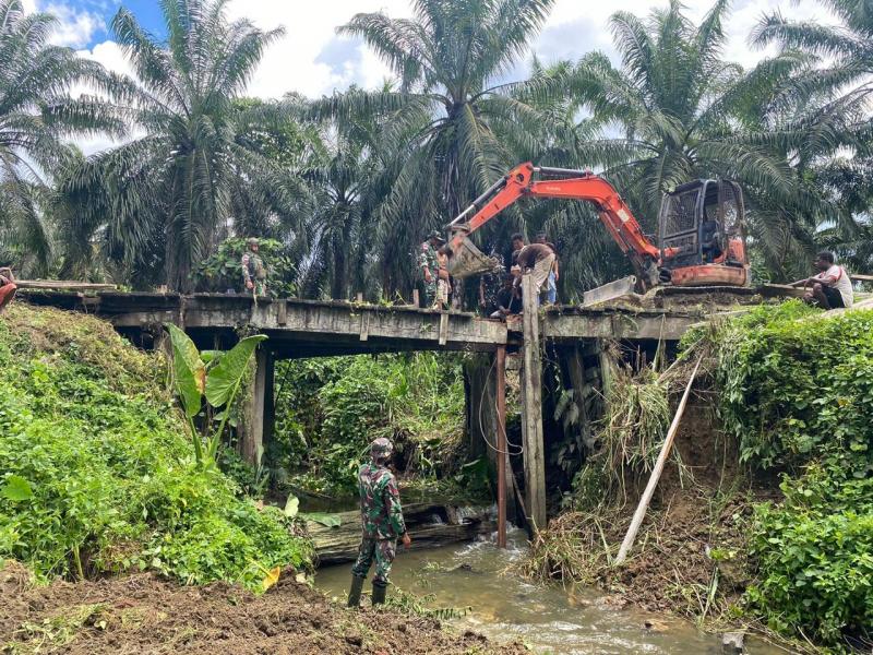 Jakarta, INDONEWS.ID - Pos Yamara Satgas Pamtas RI-PNG Yonif 131/BRS bersama masyarakat bergotong royong memperbaiki jembatan yang menghubungkan jalan Arso menuju Arso Timur di Kampung Yamara, Distrik Waris, Kabupaten Keerom, Provinsi Papua, Selasa (11/2/2025).