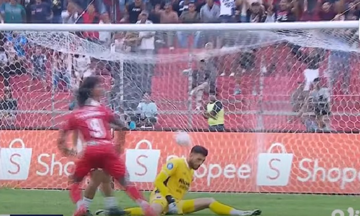 Sepakannya dapat diantisipasi dan berhasil ditepis kiper Arthur Silva. Ini terjadi pada menit ke-45 dan hingga babak pertama selesai, tuan rumah masih unggul 1-0.
