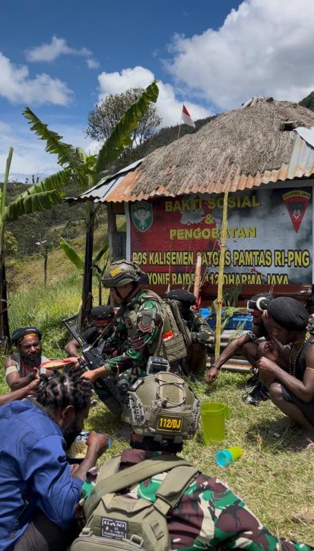 Puncak jaya, INDONEWS.ID - Pos kalisemen Satgas Yonif 112/DJ didesa Wondenggobak, Kabupaten Puncak Jaya Provinsi Papua Tengah menyelenggarakan program Bhakti Sosial dengan memeriksa Kesehatan dan Berbagi Kebahagiaan dibulan suci Ramadhan 1446 H dengan memberikan layanan pengobatan dan membagikan makanan kepada masyarakat, Sabtu (8/3/2025).