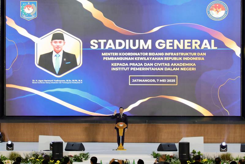 JATINANGOR, INDONEWS.ID - Menteri Koordinator Bidang Infrastruktur dan Pembangunan Kewilayahan, Agus Harimurti Yudhoyono (AHY), memberi kuliah umum di hadapan ribuan praja Institut Pemerintahan Dalam Negeri (IPDN) di Jatinangor, Selasa (7/5/2025).