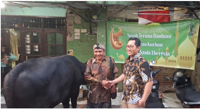 Pastor Kepala Paroki Santa Theresia, Romo Benny Beatus Wetty, SJ mewakili Dewan Paroki Harian dan umat Gereja Santa Theresia Jakarta menyerahkan satu ekor sapi kepada Ustaz Babay dalam rangka perayaan Iduladha 2025.