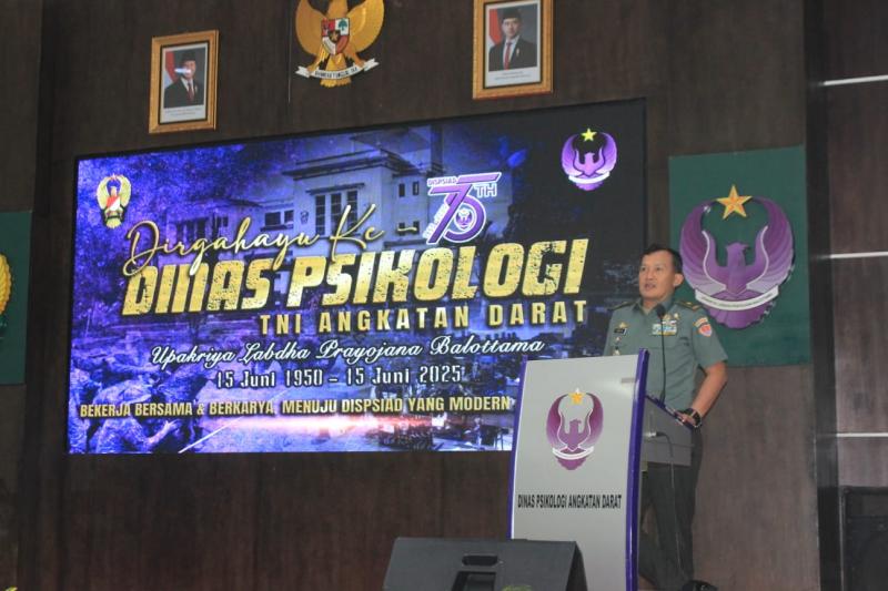 Bandung, INDONEWS.ID - Dinas Psikologi Angkatan Darat (Dispsiad) menggelar acara syukuran peringatan Hari Ulang Tahun ke - 75 Dispsiad yang dipimpin langsung oleh Kepala Dinas Psikologi TNI Angkatan Darat (Kadispsiad) Brigjen TNI Sony Hendayana, S.Psi., M.Si. bertempat di Gedung Upala Pratama, Madispsiad, Bandung, Jawa Barat, Senin (16/6/2025)