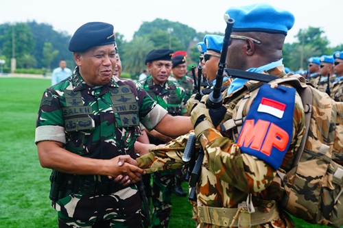 Jakarta, INDONEWS.ID - Inspektur Jenderal (Irjen) TNI Letjen TNI Muhammad Saleh Mustafa mewakili Panglima TNI Jenderal TNI Agus Subiyanto menjadi Inspektur Upacara Pemberangkatan Satgas Kizi TNI Kontingen Garuda XX-V MONUSCO Kongo TA. 2025, di Lapangan PRIMA, Mabes TNI, Cilangkap, Jakarta Timur, Kamis (19/06/2025).