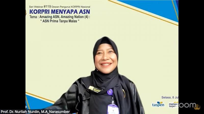 KORPS Pegawai Republik Indonesia Dewan Pengurus Nasional mengadakan Webinar Korpri Menyapa ASN seri ke-119 mengusung tema “Amazing ASN, Amazing Nation: ASN Prima Tanpa Malas”.