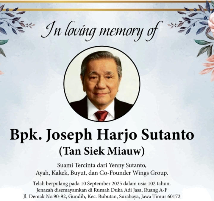 Kabar duka datang dari dunia bisnis Indonesia. Salah satu pendiri konglomerasi besar Tanah Air, Wings Group, Joseph Harjo Sutanto, wafat pada Rabu (10/9/2025) dalam usia 102 tahun.
