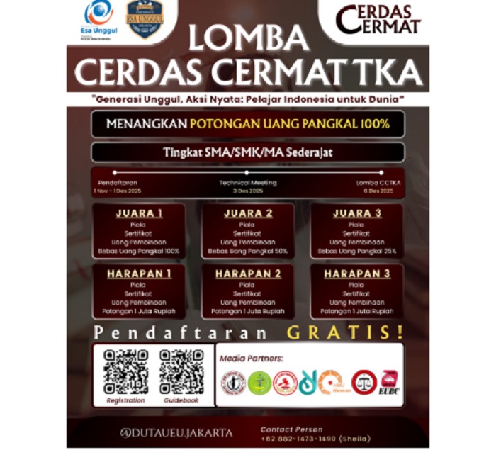 Dalam upaya menumbuhkan semangat kompetisi dan meningkatkan kualitas generasi muda Indonesia, Duta Kampus Universitas Esa Unggul Jakarta menyelenggarakan kegiatan Lomba Cerdas Cermat TKA (CCTKA) 2025.