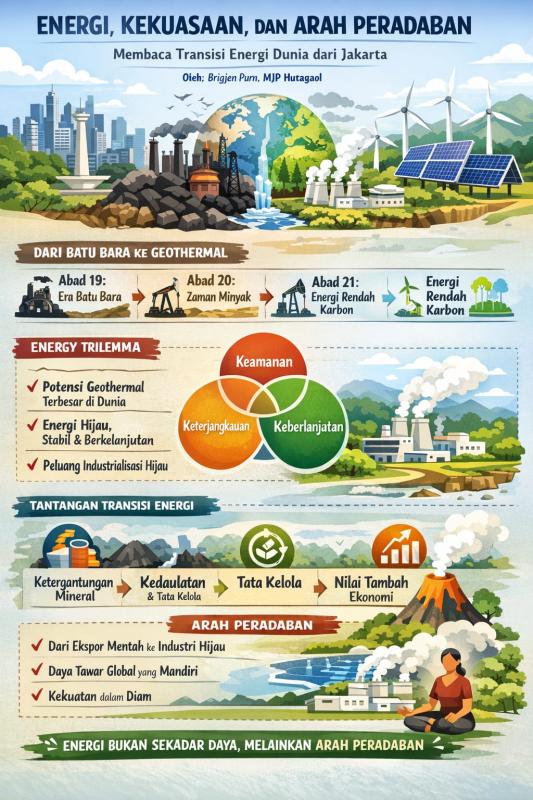 karbon—listrik bersih, teknologi hijau, dan mineral strategis—membuka arena baru persaingan global. Di titik inilah transisi energi bukan lagi isu teknis, melainkan isu geopolitik dan geoperadaban.