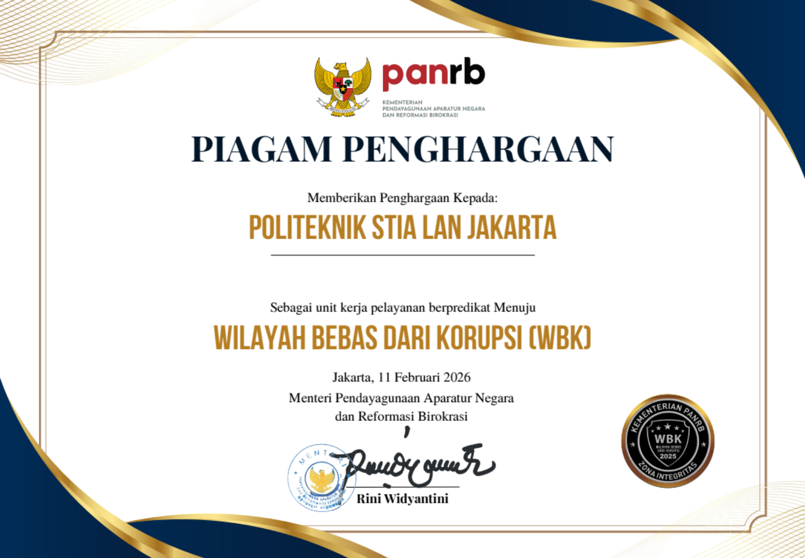 Prestasi membanggakan kembali diraih oleh Politeknik STIA LAN Jakarta setelah berhasil memperoleh ZI Award 2025 berdasarkan Keputusan Menteri PANRB Nomor 1334/2025 tentang unit kerja berpredikat menuju WBK dan WBBM tahun 2025 sebagai bentuk pengakuan atas komitmen kuat dalam membangun Zona Integritas menuju Wilayah Bebas dari Korupsi (WBK) serta peningkatan kualitas tata kelola institusi yang transparan dan akuntabel.