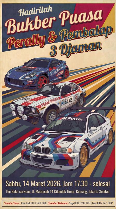 Tradisi tahunan para pembalap dan perally lintas generasi kembali digelar melalui acara “Bukber Puasa Perally dan Pembalap 3 Djaman” yang akan berlangsung pada Sabtu, 14 Maret 2026 pukul 17.30 WIB di The Balai Sarwono, Jl. Madrasah No.14, Kemang, Jakarta Selatan.